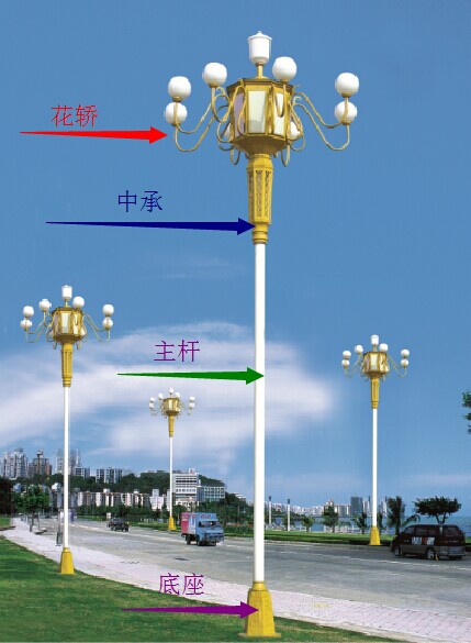 高端大氣,上檔次,一般是8叉9火,也就是8個燈頭平均分布,中間有一個燈頭.分為:花轎,中承,底座,主桿幾個部分.因為光源比較多,所以比較亮.但是中華燈裝不了LED光源,因為中華燈的燈罩一般是不碎球,承受不了LED的高溫.下面就中華燈的圖片,給大家做個簡單的說明.