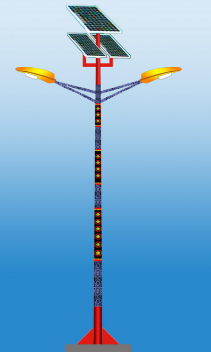 少數(shù)民族特色太陽(yáng)能路燈以少數(shù)民族達(dá)斡爾族的服飾花紋為素材,設(shè)計(jì)出具有達(dá)斡爾族特色的花紋燈桿,體現(xiàn)特有的民族文化,有效提高城市品位,增加市民的城市歸宿感和自豪感。以為能環(huán)保的LED為光源,體現(xiàn)綠色照明理念,是藝術(shù)與科技的結(jié)合。