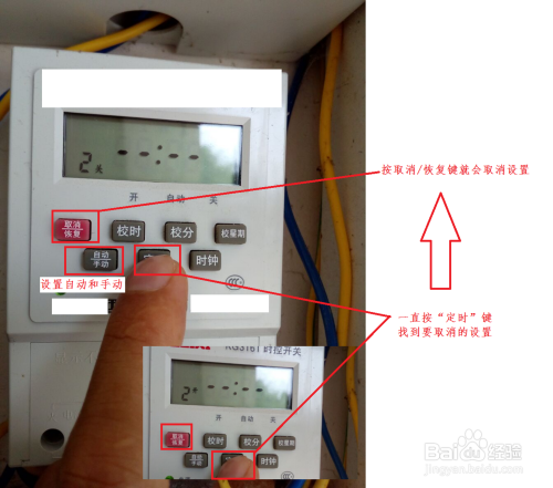這個時控開關是已經連接好電路開始使用了的,已經設置了第一個開啟和關閉的時間,現在需要解鎖——連續按“取消/恢復”鍵四次解鎖——如果時鐘不準確可以按下時鐘,然后按校星期、校時和校分設置正確的時間。