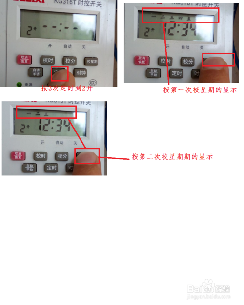 再按一下“定時”就是2開(就是連續按3次定時就到了2開即第二個設置路燈開啟的時間)——按一下校星期就會顯示周一到周日,再按一次校星期就會顯示其它的星期日期,可以根據自己的要求去選擇。