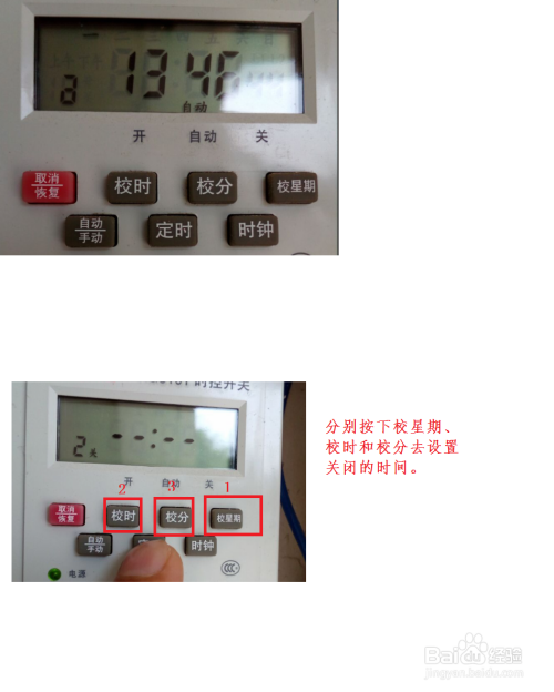 設置完成2開(第二個設置路燈開啟的時間)之后,再按一次“定時”就顯示2關,星期、時和分都歸零,這時也是按照步驟3和步驟4設置星期、時和分,這樣第二個路燈關閉的時間就設置好了。